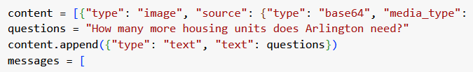 Using an example from Anthropic’s cookbook on github, I created a chat-bot prototype that can answer questions about the analysis that went into Arlington’s missing middle / expanded housing choice zoning update. You can pass it a pdf and questions, and get an answer. I fed it the Missing Middle Housing Study Research Bulletin 2 and asked it how many more housing units does Arlington need: